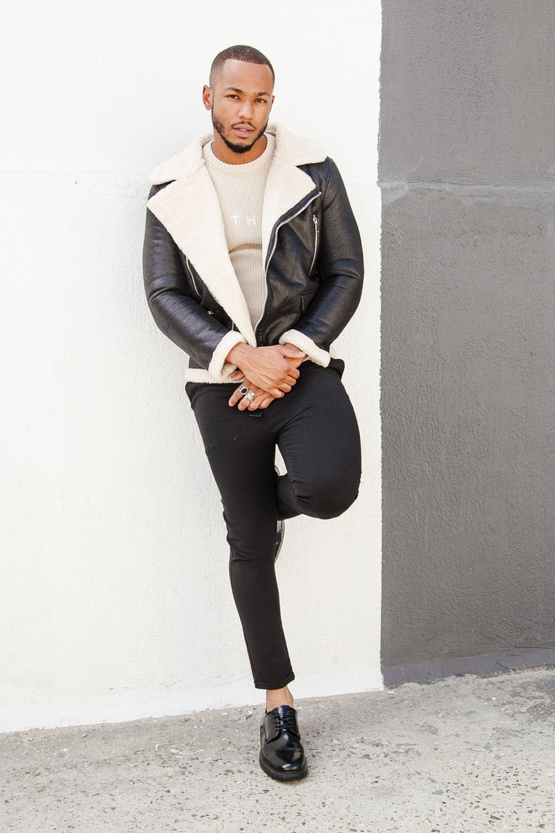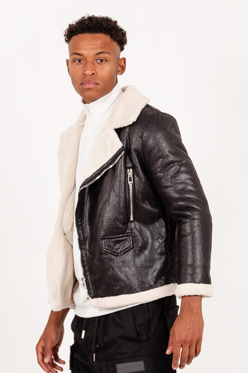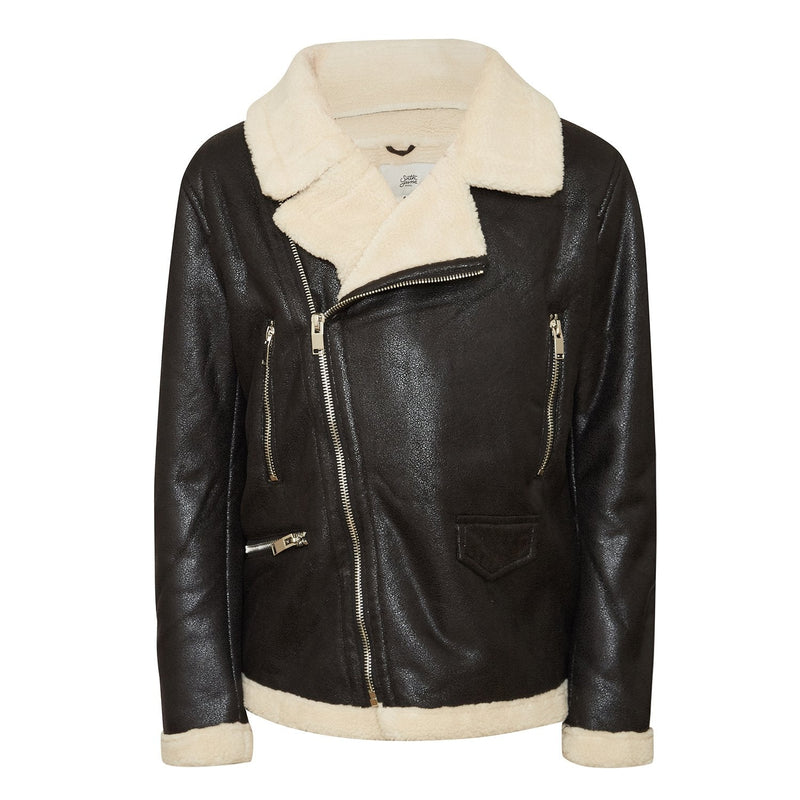 Style aviateur avec intérieur, col, extrémités des poignets et de la taille en sherpa.
