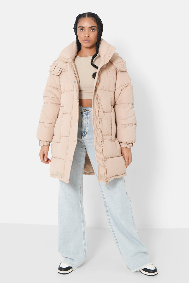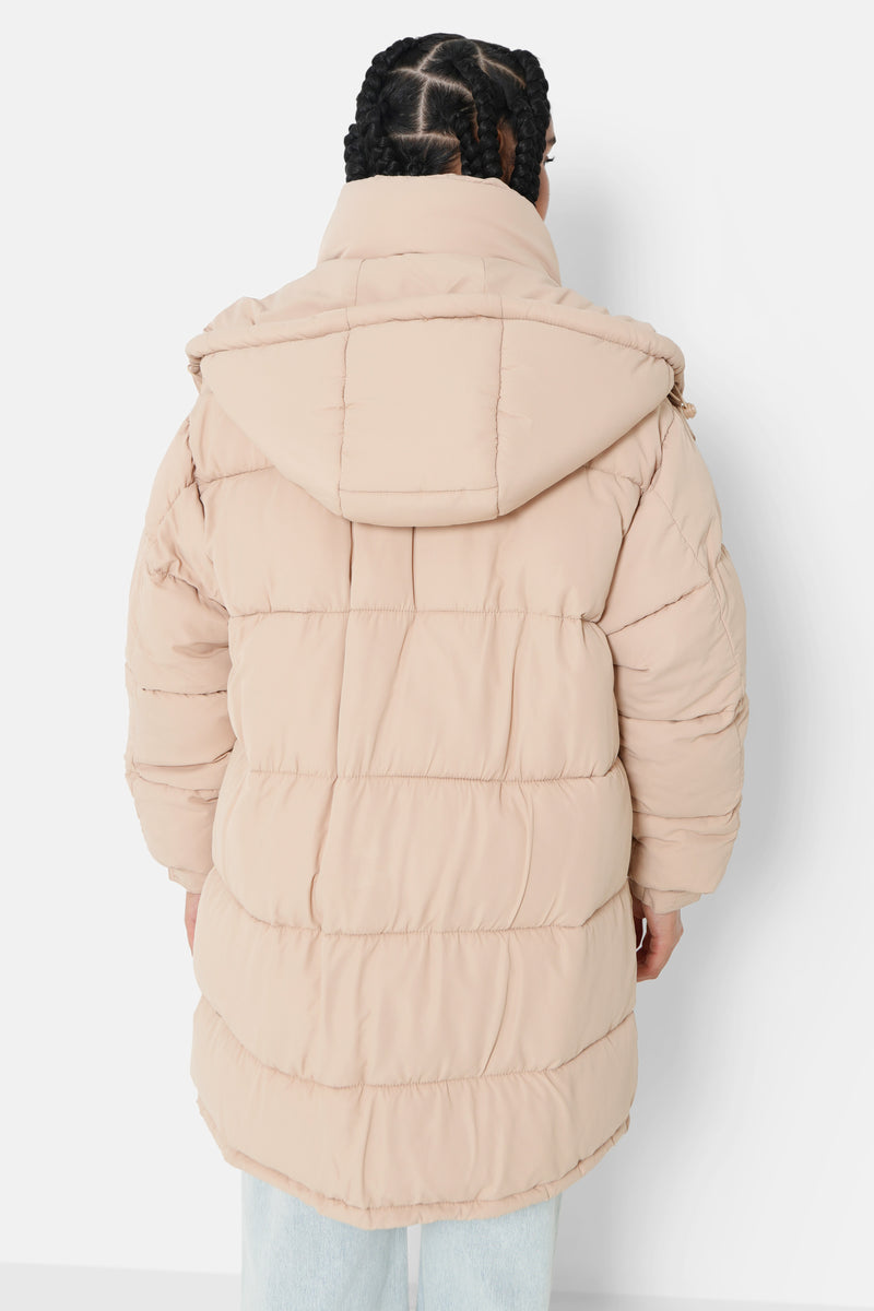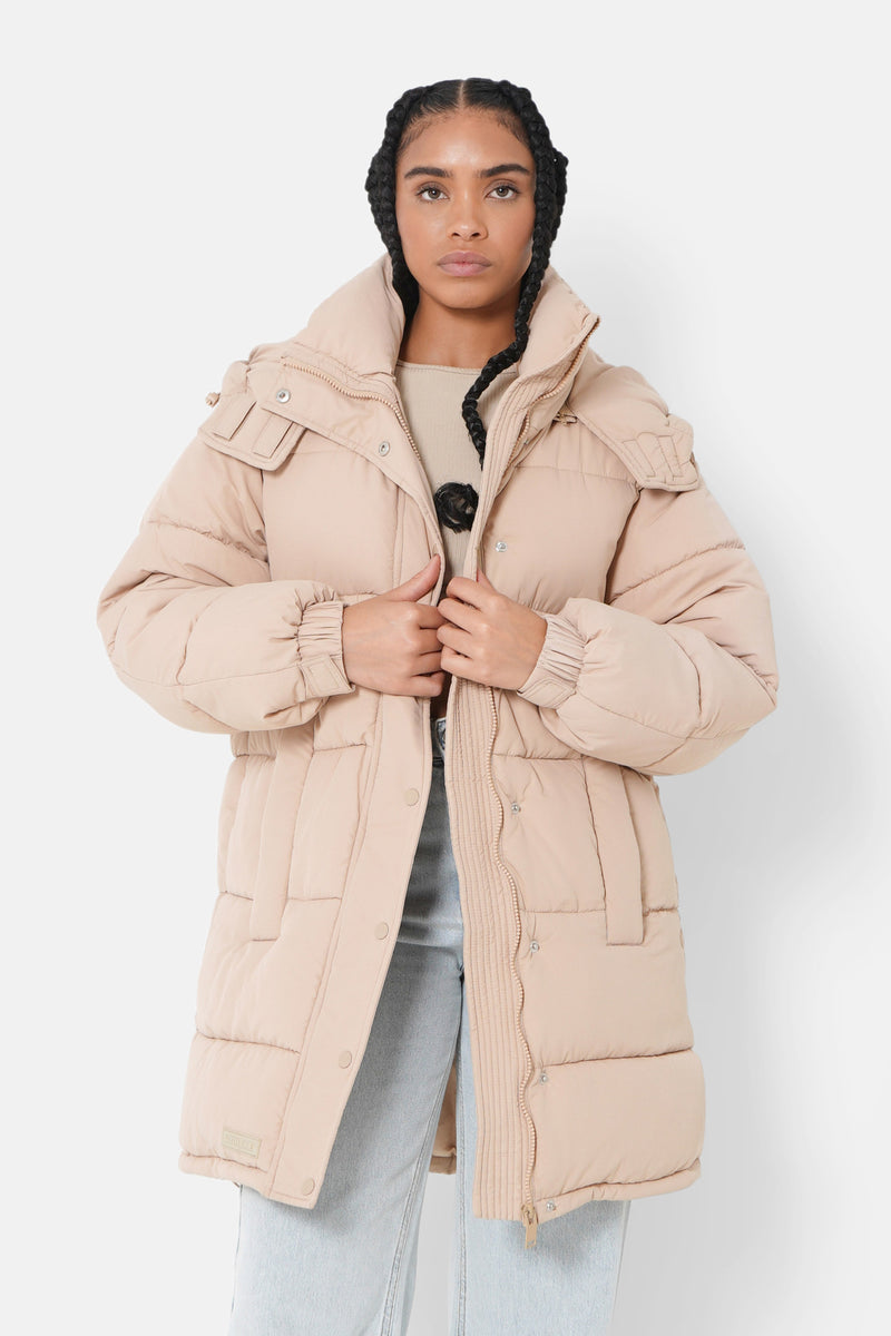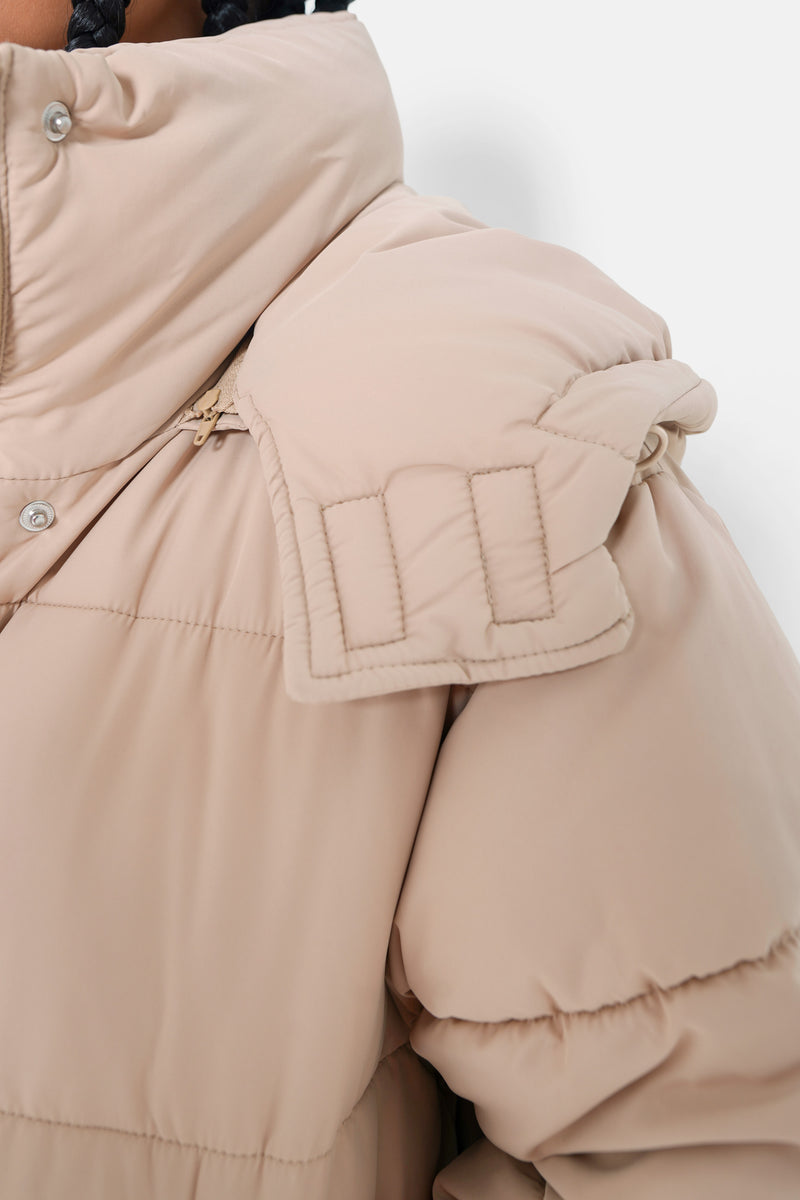 Effet matelassé et rembourré, poches latérales avec fermeture à zip, fermeture centrale à zip également et à bouton-pression.