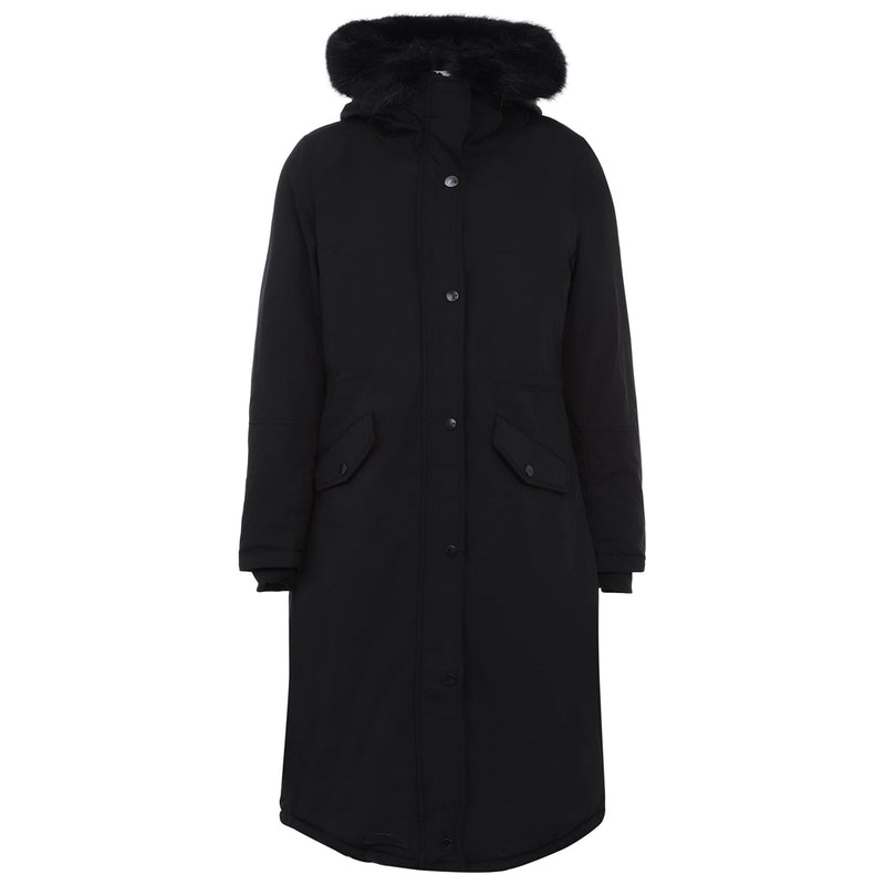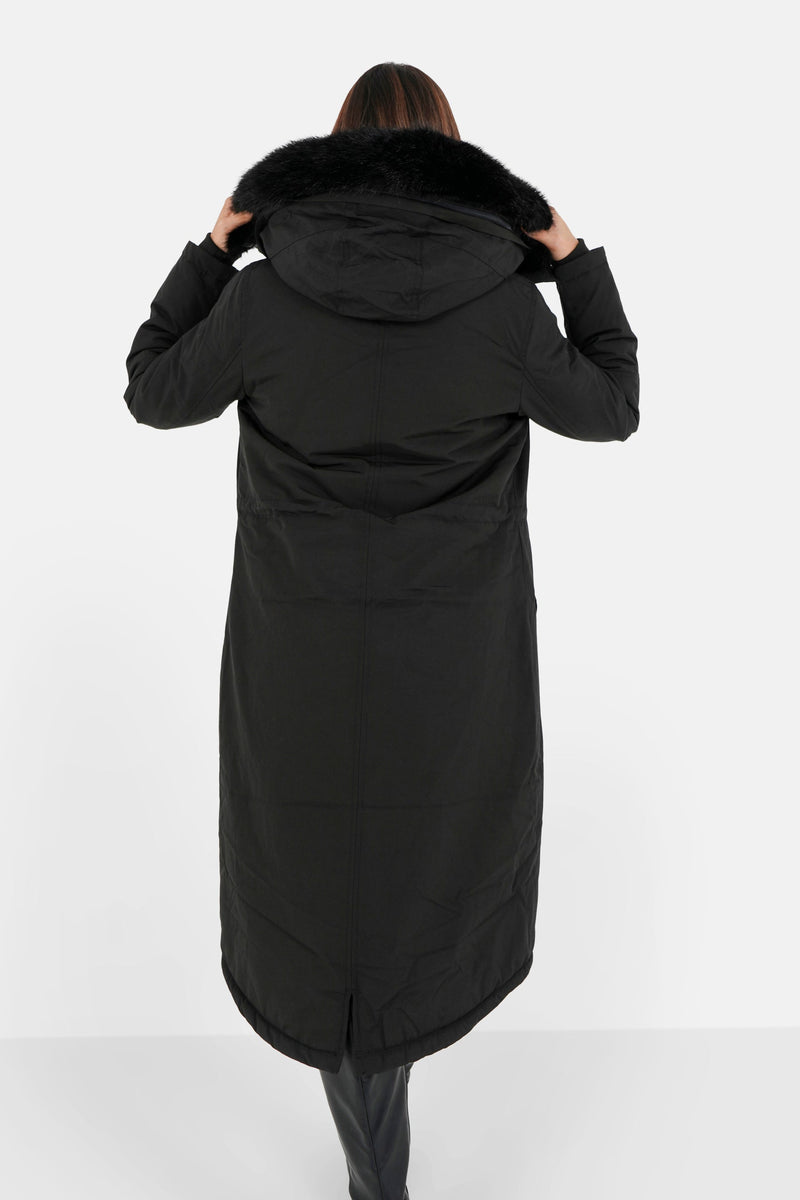 Fausse fourrure amovible au niveau de la capuche, poches à l'avant (doublées), fermeture boutonnée et zippée, bords-côtes aux poignets, taille ajustable à l'intérieur, poche intérieure.