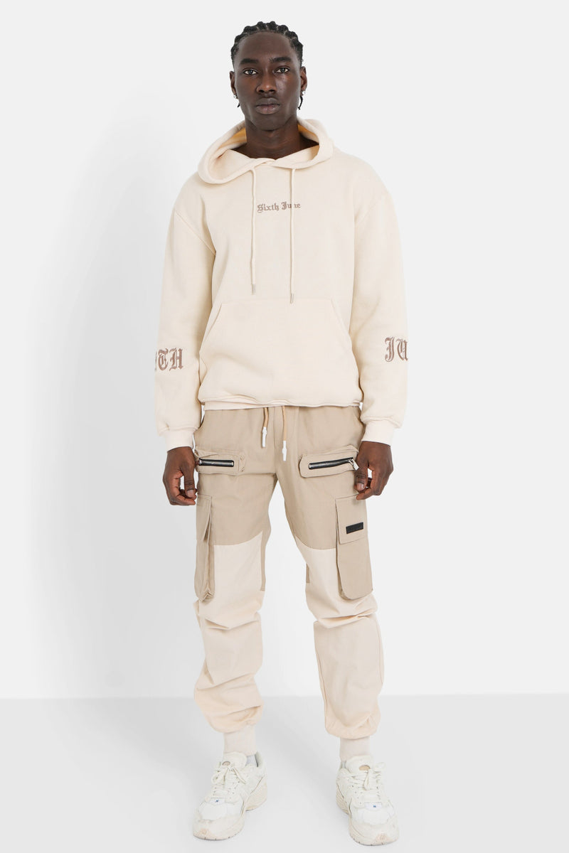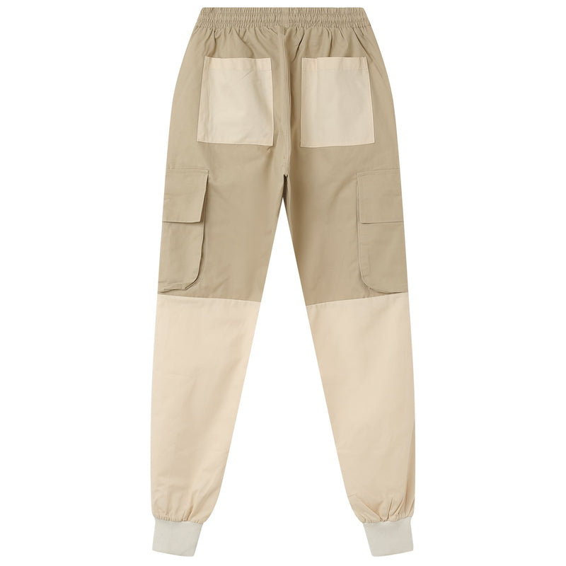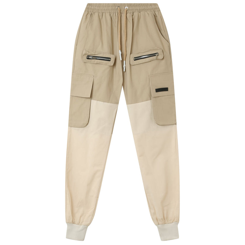 Tissu bicolore, poches cargo, fausses poches à zip, poches latérales, poches arrières.