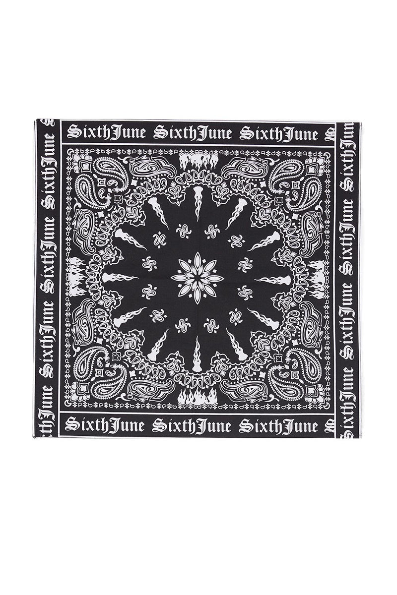 Bandana Sixth June, avec un imprimé Paisley et logo gothique sur une face. Format carré et tissu semi-épais. Modèle noir.