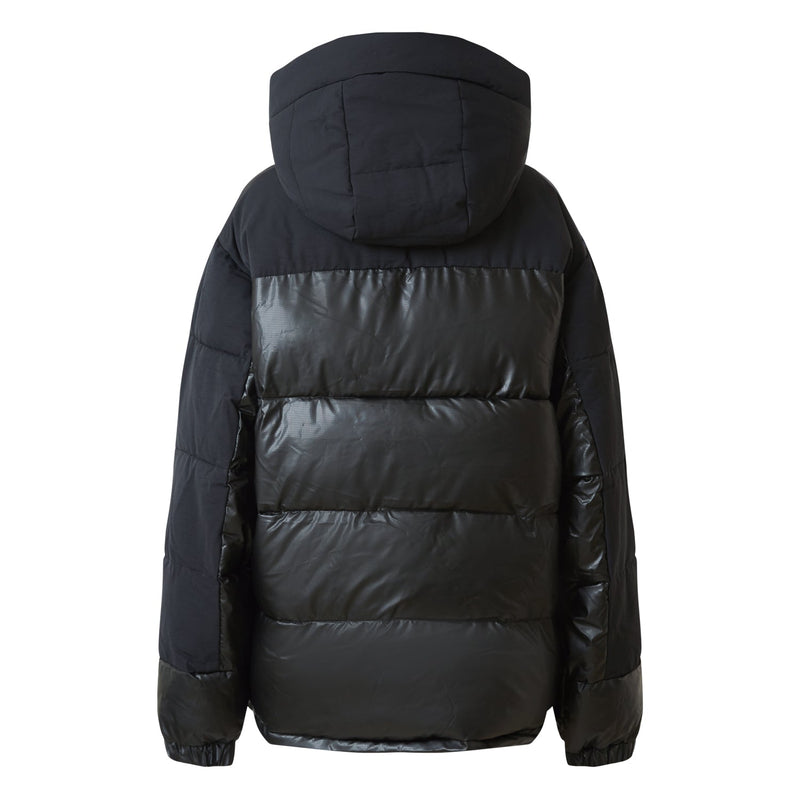 Bi-matière en nylon noir et noir métallisé, effet matelassé et rembourré, logo Sixth June imprimé près de l'épaule.