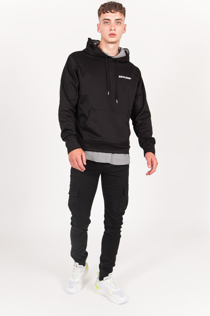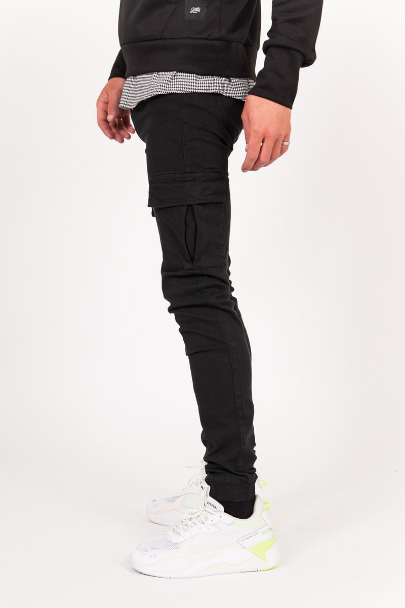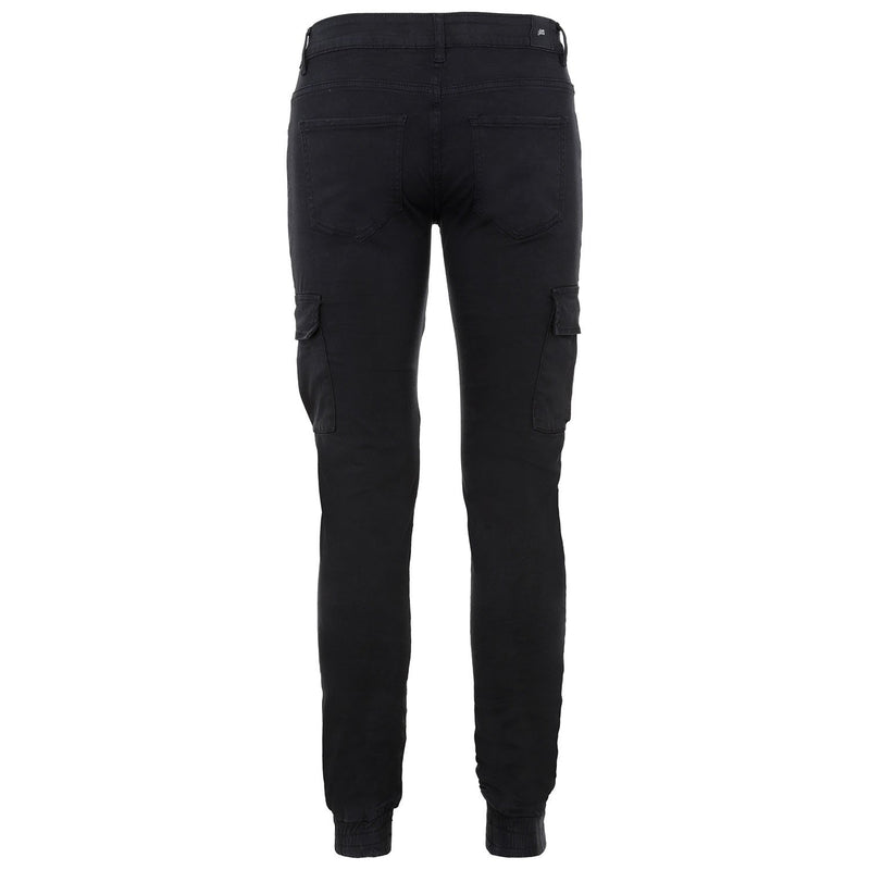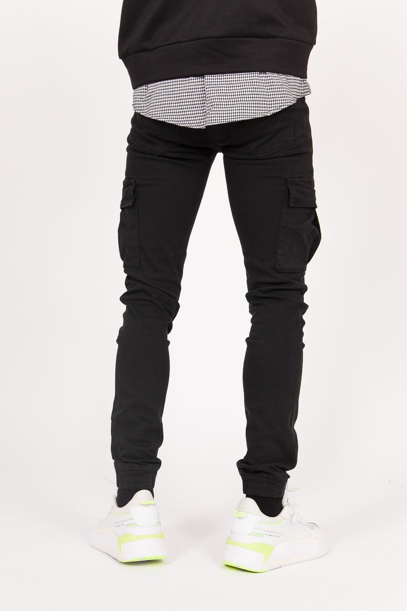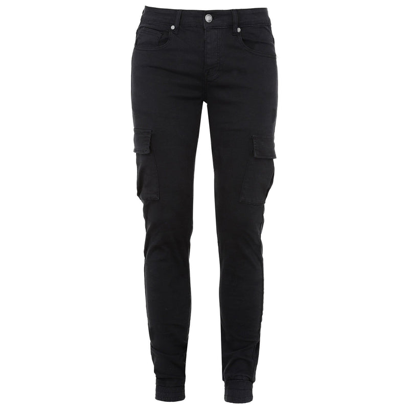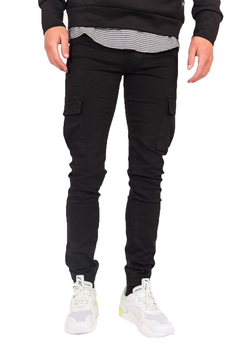 Jean Sixth June homme avec poches cargo sur les côtés. Coupe slim et élastiques au niveau des chevilles. Modèle noir.