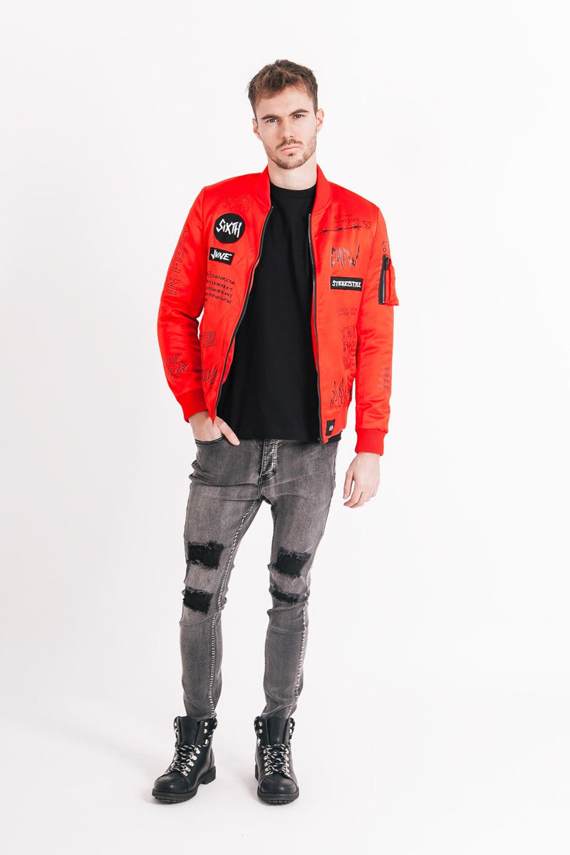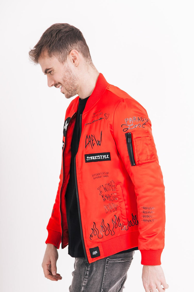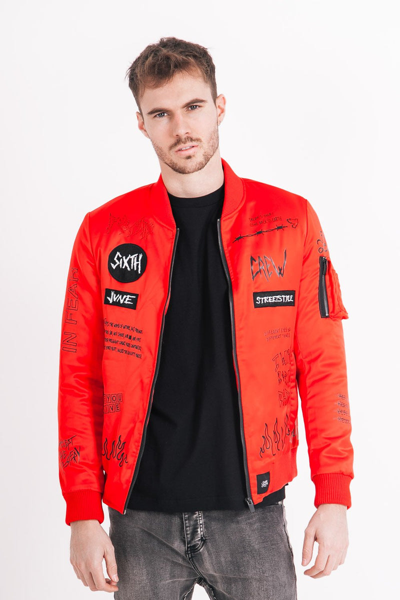 Multiples patchs à l'avant (SIXTH JUNE, CREW, STREETSTYLE), inscriptions sur l'ensemble du bombers, à l'avant et à l'arrière, imprimé flammes sur le bas. Poche avec zip sur le bras gauche, col, poignets et base côtelé, Poches latérales avec fermeture à zip, poche intérieure.