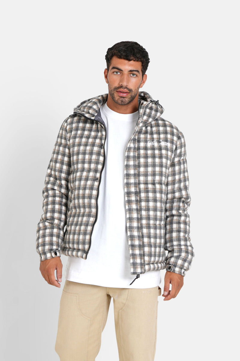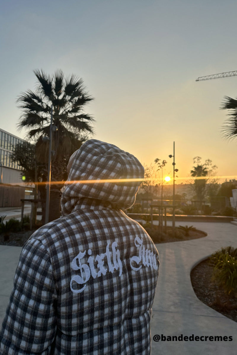 Matière duveteuse, effet matelassé, logo en patch bouclette en gros au dos, logo brodé en caractère gothique à l'avant près de la poitrine.
