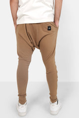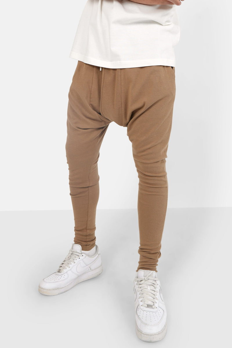 Coupe ample à l'entrejambe, coupe slim au niveau des mollets, cordon de serrage à la taille. Modèle beige "sable" uni.
