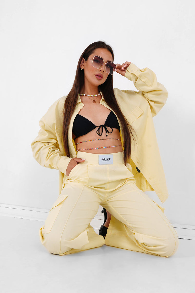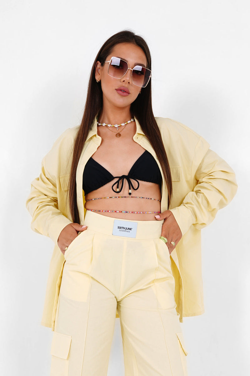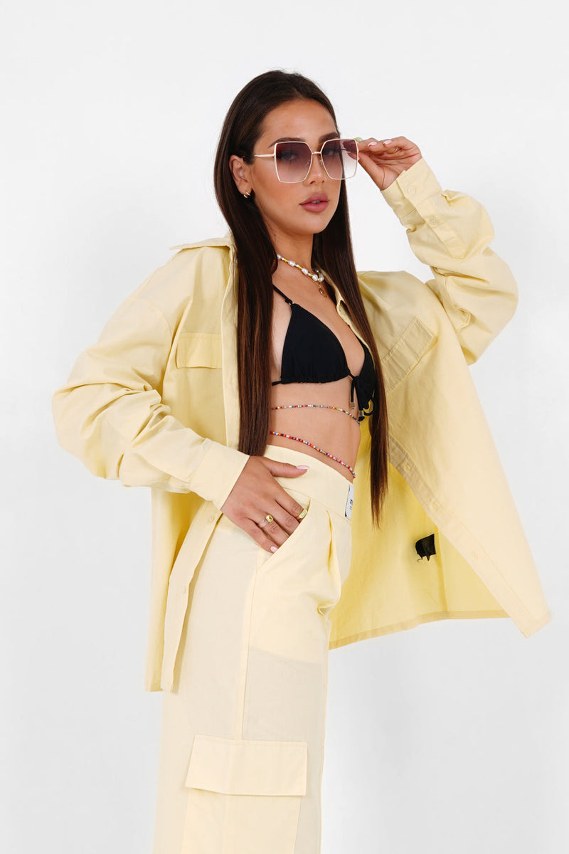 Deux fausses poches à rabats à l'avant près de la poitrine, fermeture centrale à boutons.
