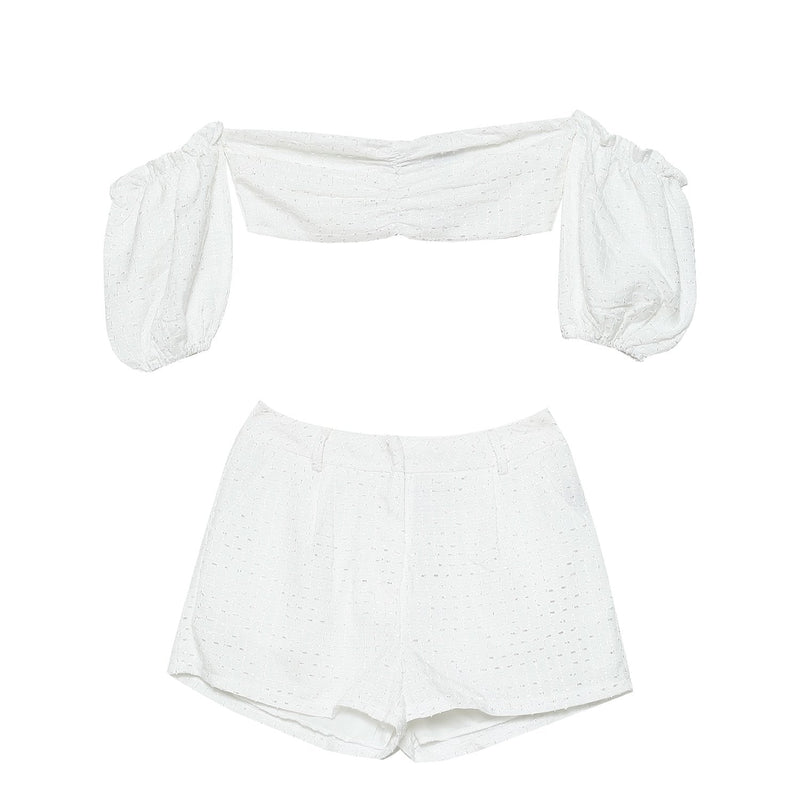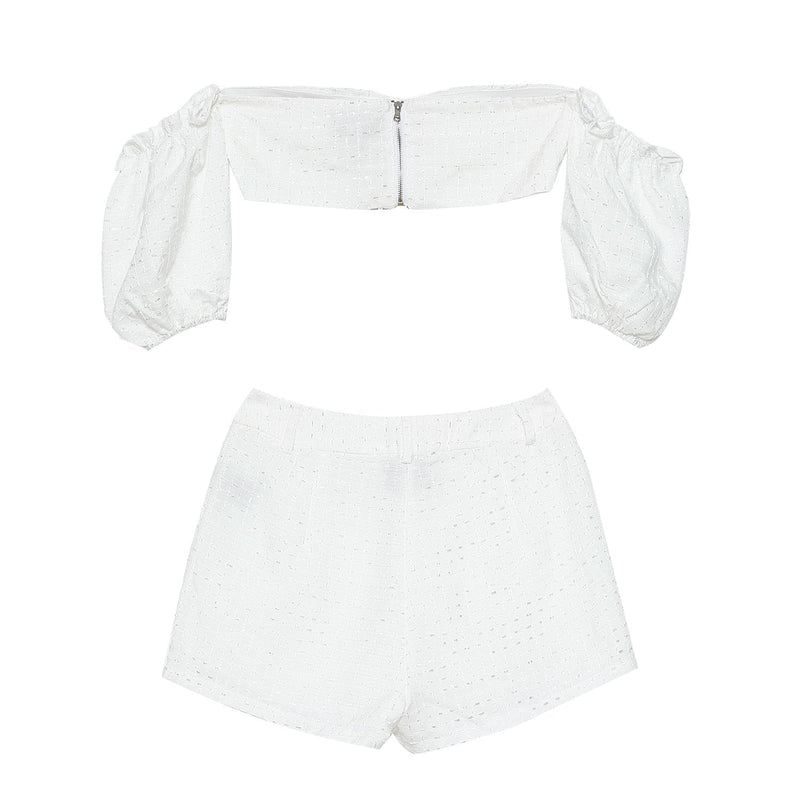 Top court bustier avec épaules dénudées, manches courtes bouffantes avec élastiques, short taille haute avec fermeture zippée et à cran. Motif à carreaux avec fil nacré, matière texturée.