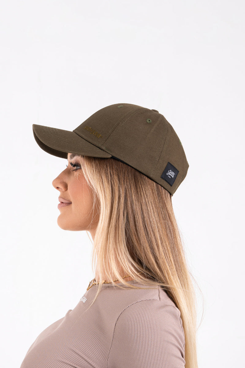 Logo brodé de la même couleur que la casquette sur le côté gauche (une fois portée). Taille ajustable à l'arrière par une patte de serrage, visière courbée.