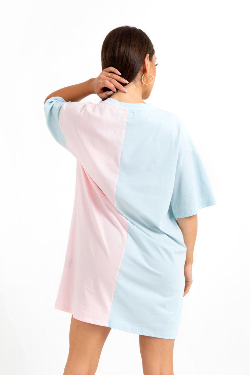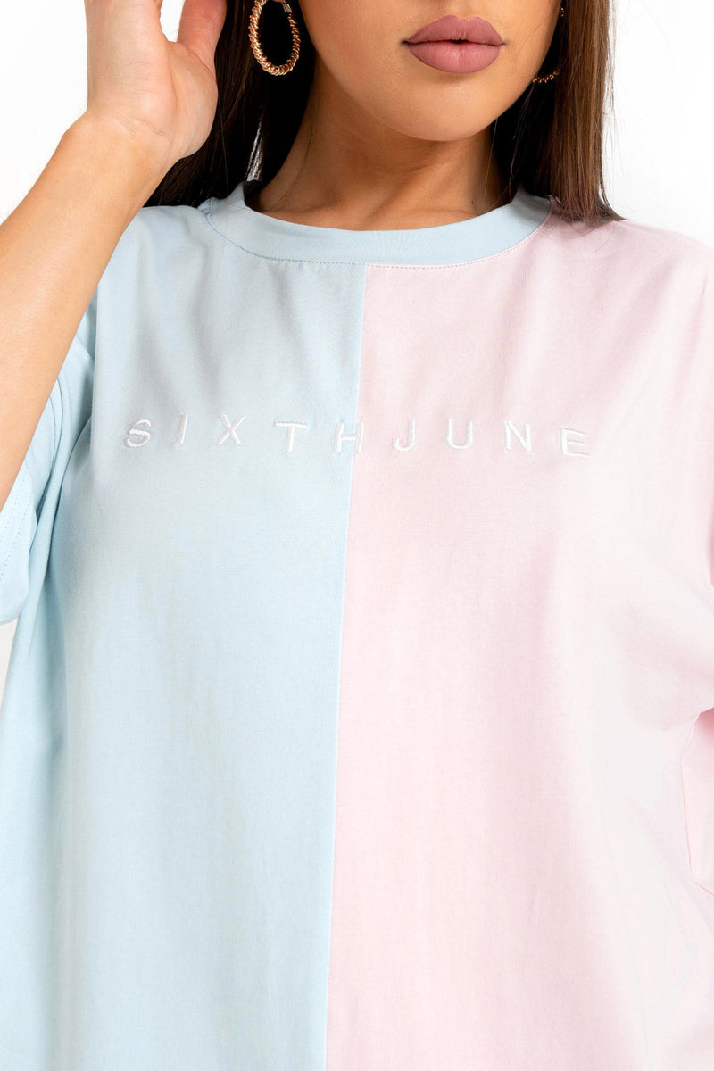Tissu bicolore avec une parti rose et une partie bleue. Sixth June brodé à l'avant sur la poitrine.