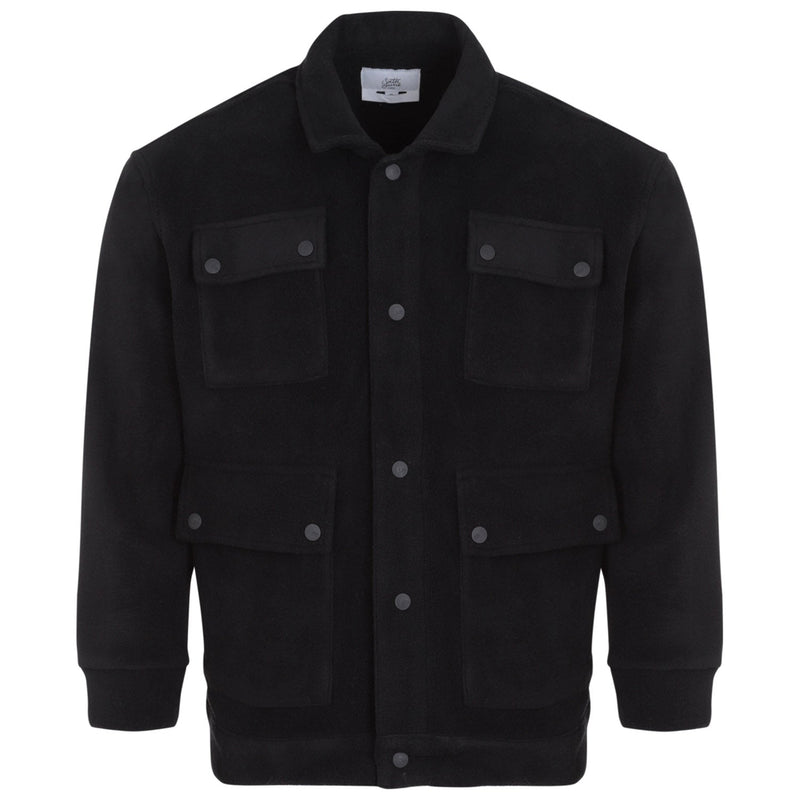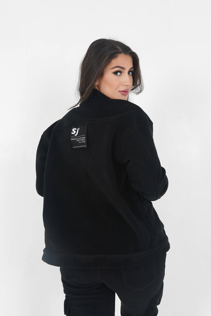Tissu polaire, quatre poches à rabats à l'avant avec fermeture à boutons pression. Fermeture centrale boutonnée, languettes tissée dans le dos avec inscription SJ et du texte.