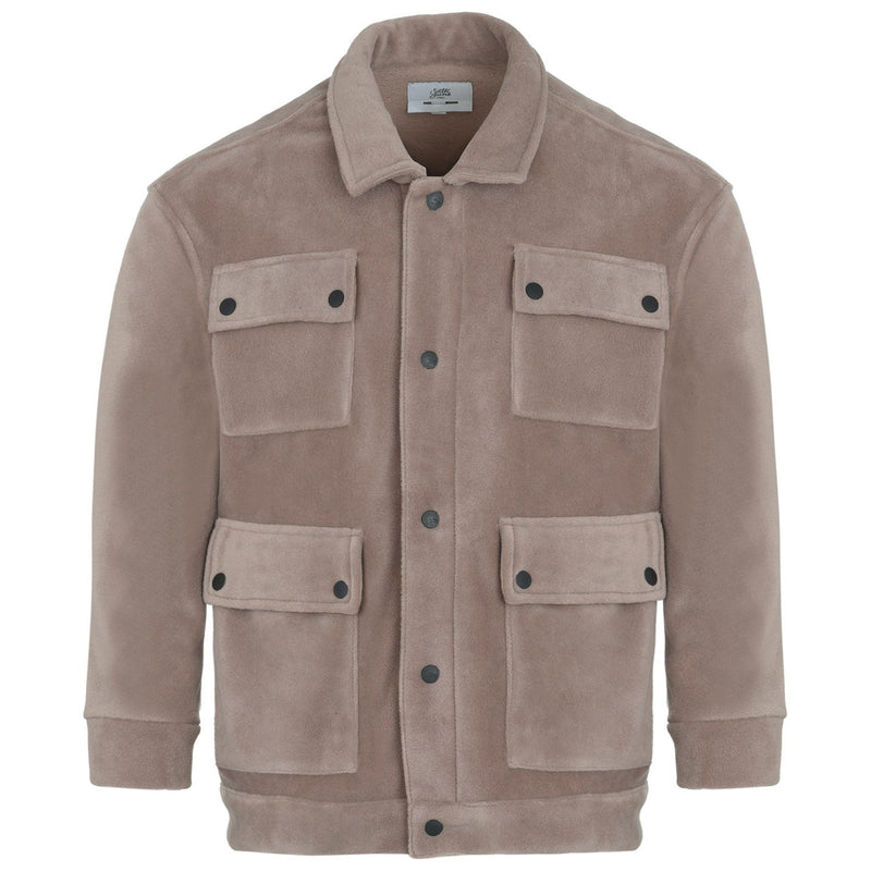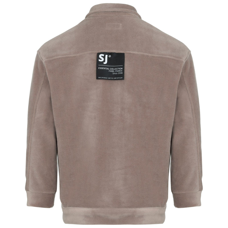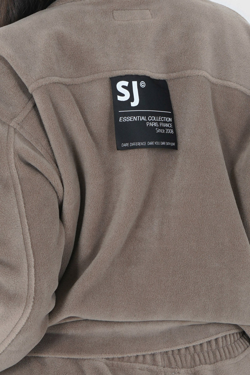 Tissu polaire, quatre poches à rabats à l'avant avec fermeture à boutons pression. Fermeture centrale boutonnée, languettes tissée dans le dos avec inscription SJ et du texte.