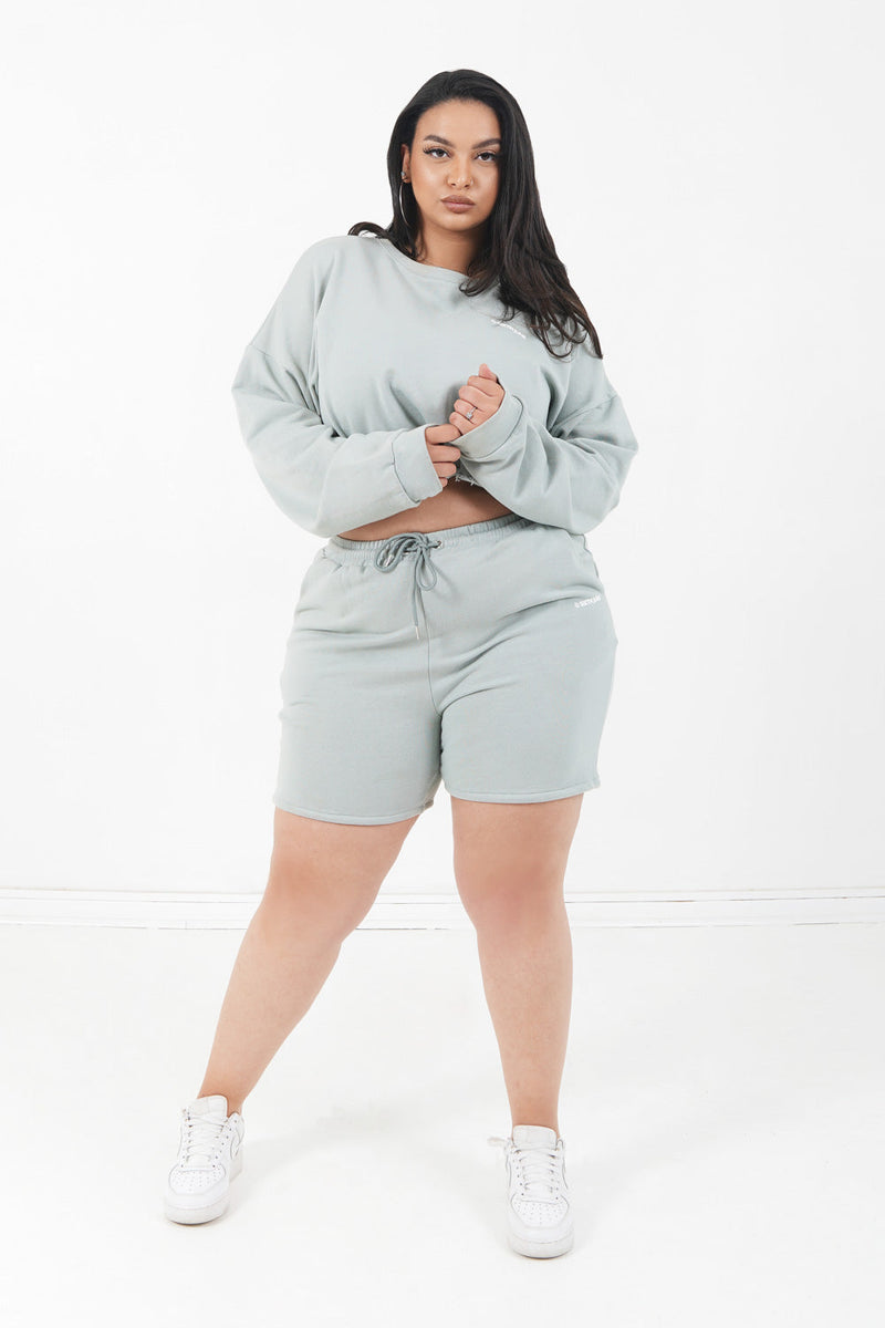 Sweatshirt pour femme de marque Sixth June. Inscription Sixth June imprimée à l'avant et au dos avec un texte. Bords côtes aux poignets, col rond. Coupe classique et courte façon crop top. Modèle vert.
