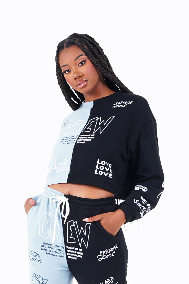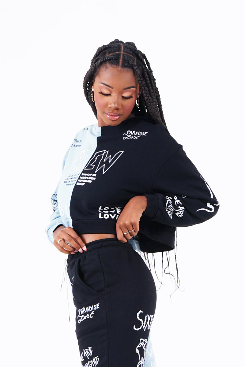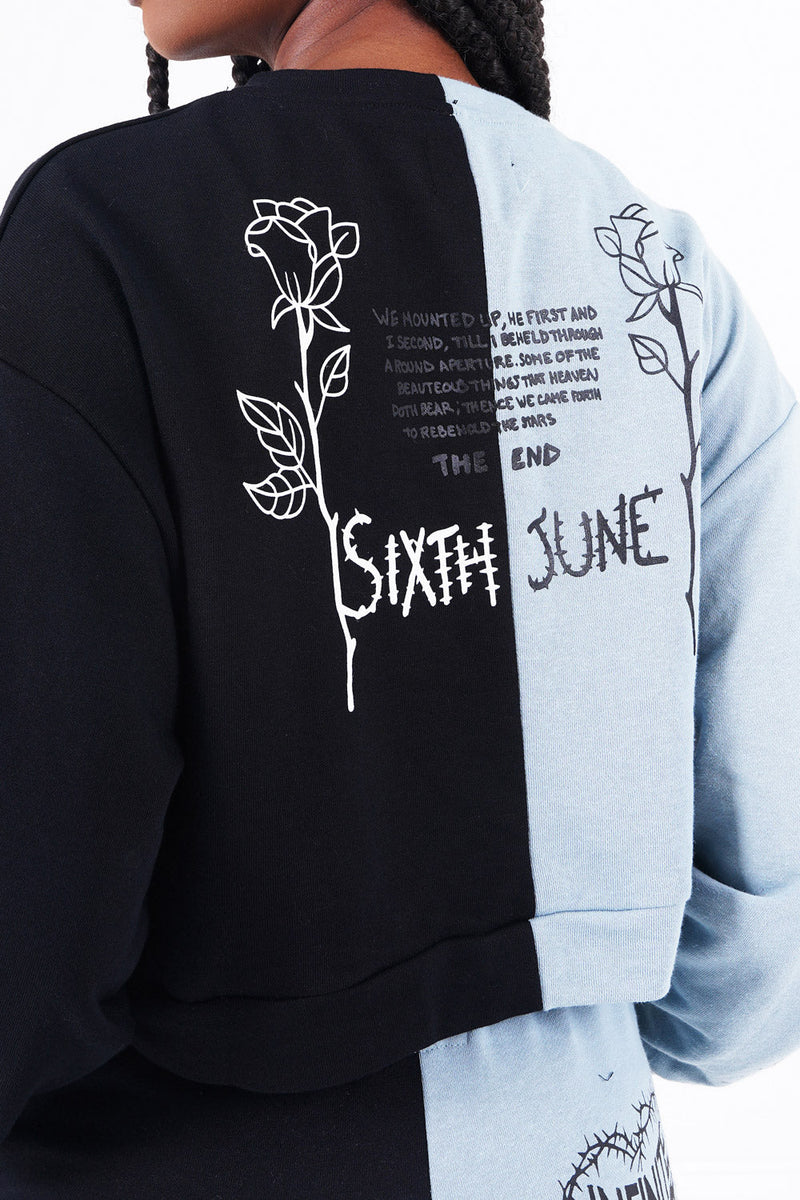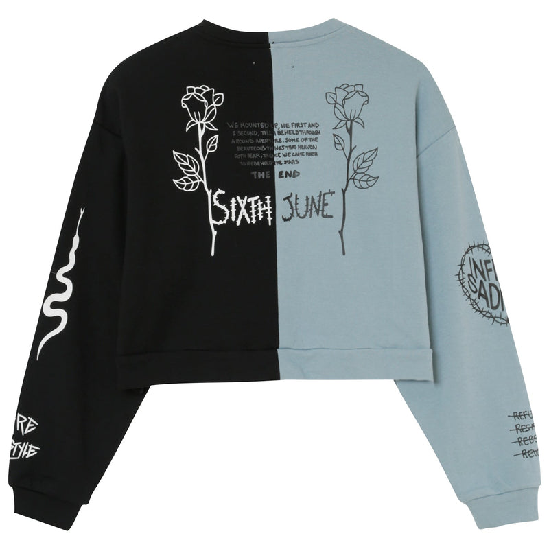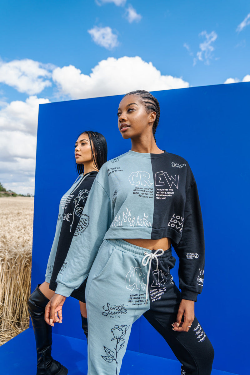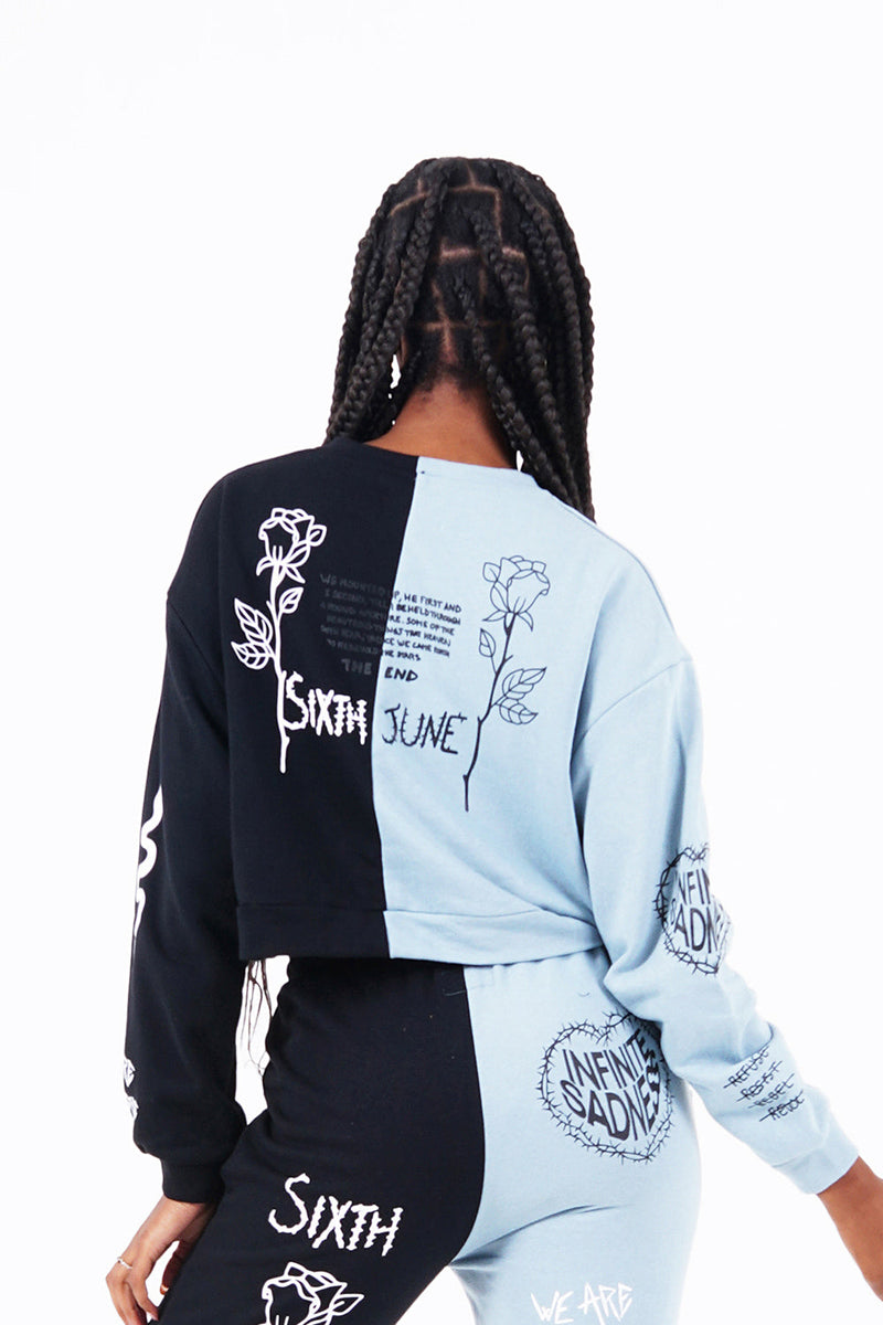 Multiples imprimés sur l'ensemble du sweat, à l'avant et à l'arrière. Tissu bleu du côté droit, tissu noir du côté gauche, col rond, élastiques aux poignets.
