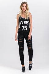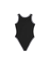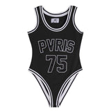 Schwarzer Damen-Body von Sixth June. Aufschrift „Pvris 75“ auf der Vorderseite. Hoher Schnitt. Inspiration für Basketballtrikots. Druckknopfverschluss im Schritt.
