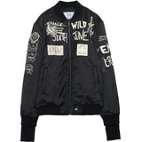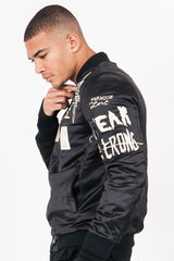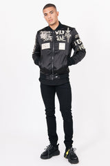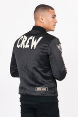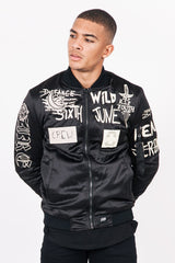 Bomberjacke von Sixth June für Herren aus Satinmaterial mit fluoreszierenden Aufdrucken (im Dunkeln sichtbar). Klassischer Schnitt, Schriftzug und Muster auf der Vorderseite (Crew, Wild, Sixth June...), „CREW“-Schriftzug auf der Rückseite, gerippte Kanten an Saum, Kragen und Manschetten, Reißverschluss, Taschen, Seitentaschen und eine Innentasche, Reißverschluss am linken Arm. Schwarzes Modell.