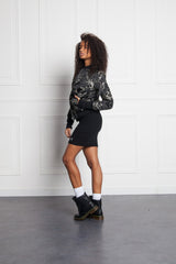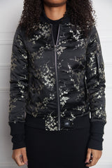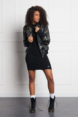 Schwarze Bomberjacke für Damen von Sixth June, Blumendruck. Reißverschluss vorne. Reißverschluss am linken Arm. Zwei Seitentaschen. Doppelte Ärmel an den Handgelenken.