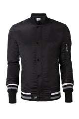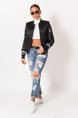 Schwarze Bomberjacke für Damen von Sixth June. Von Bullen inspiriert. Aufschrift „Pvris 75“ auf der Rückseite. Reißverschluss und Knöpfe vorne. Reißverschluss am linken Arm. Bulls-Stil.