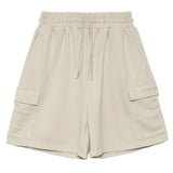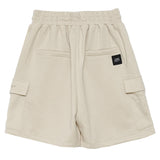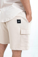 Herrenshorts der Marke Sixth June. Seitliche Cargotaschen mit Klappenverschluss. Vordertaschen, künstliche Gesäßtaschen, elastischer Bund mit Kordelzug. Klassischer Schnitt. Beigefarbenes Modell.