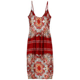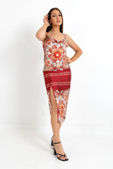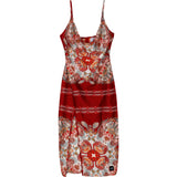Überall orientalisches Muster, Satinstoff, dünne verstellbare Träger. Wasserfallausschnitt, Schlitze am rechten Bein, Reißverschluss hinten, Logo-Patch am vorderen Saum.