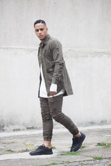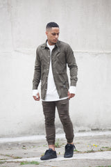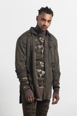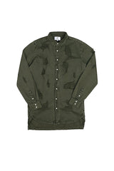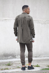 Herrenhemd von Sixth June mit Denim-Material und Rissen vorne und hinten. Unten lang geschnitten und an den Schultern klassisch. Khakigrünes Modell.