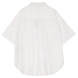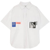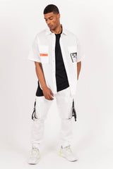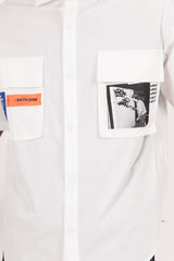 Kurzarmhemd der Marke Sixth June für Herren. Cargotaschen auf der Brust mit Foto-Tag-Prints und bunten Aufnähern. Schnappverschluss. Sehr weiter Oversize-Schnitt. Weißes Modell.