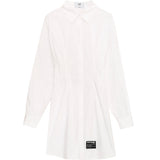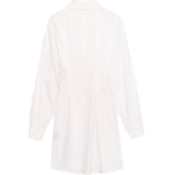 Langärmliges Hemdkleid für Damen von Sixth June. Korsett in der Taille mit gerafftem Stoff. Zentraler Knopfverschluss. Spannlaschen an den Manschetten, Aufnäher mit Aufdruck und Text auf der Vorderseite unten. Klassischer Schnitt, Minilänge. Weißes Modell.