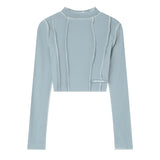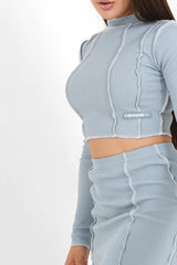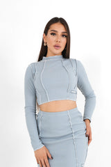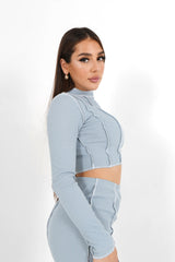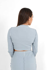 Gerippter Stoff mit verdeckter Naht vorne. Halbhoher Kragen, Logo auf Gummipatch.