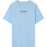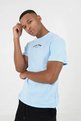 Blaues T-Shirt mit gebogenem Logo vorne und hinten