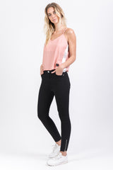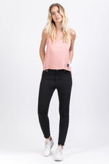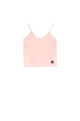 Damen-Tanktop von Sixth June aus Satinmaterial mit weißen Streifen an den Seiten. Leichtes Material, dünne Träger und kurzer Schnitt. Rosa Modell.
