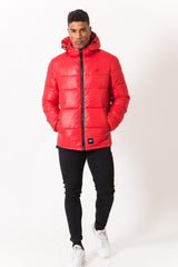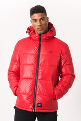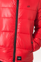Herren-Daunenjacke der Marke Sixth June. Glänzendes Material, Vinyleffekt. Kleines Logo auf der Brust, integrierte Kapuze, Reißverschluss, 2 Seitentaschen, Innentasche. Klassischer Schnitt. Rotes Modell.