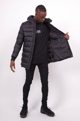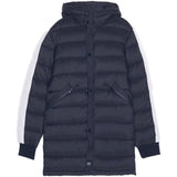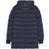 Sixth June Daunenjacke für Herren mit Bändern an den Ärmeln. Klassischer mittellanger Schnitt, gerippte Bündchen, Kapuze (nicht abnehmbar), Seitentaschen und Knopf- und Reißverschluss. Schwarzes Modell mit weißen Streifen.