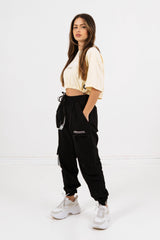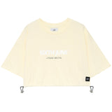 Kurzarm-T-Shirt für Damen der Marke Sixth June. Aufdruck „Sechster Juni“ in der Mitte. Elastische Kordelzüge vorne. Weiter Schnitt und überschnittene Schultern. Gelbes Modell.