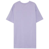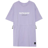 Kurzarmkleid für Damen der Marke Sixth June. Aufdruck „Sechster Juni“ in der Mitte. Kordelzug mit Gummizug in der Taille. Schmale Passform und überschnittene Schultern, Minilänge. Lila Modell.
