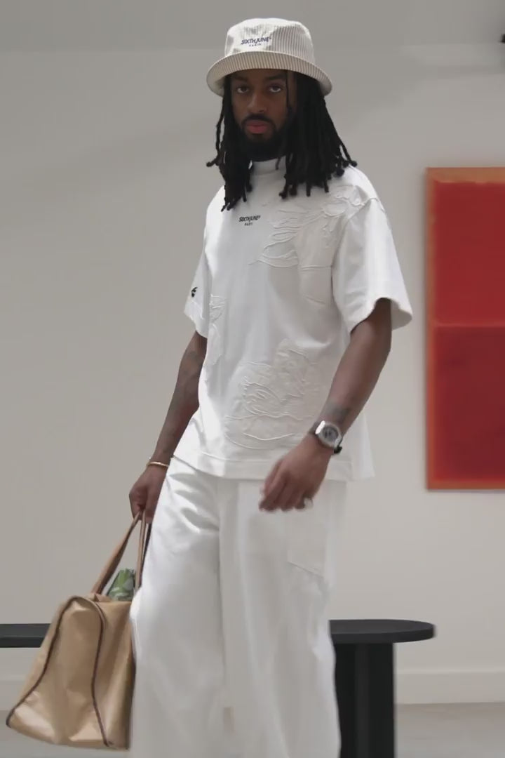 Auf der Vorderseite befinden sich Ton-in-Ton gestickte Blumen.