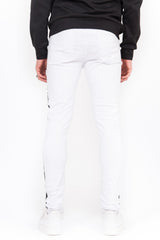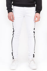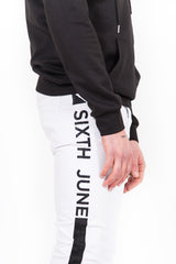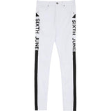 Sixth June-Jeans für Herren mit Bändern und „Sixth June“-Aufdruck an den Beinen. Enger Schnitt (nah am Körper), Taschen vorne und hinten. Weißes Modell mit schwarzen Streifen.