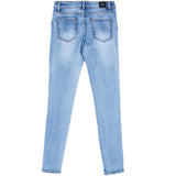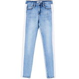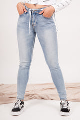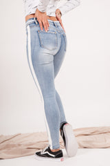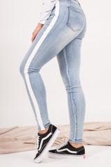 Damenjeans von Sixth June mit Bändern an den Beinen. Enger Schnitt, Seiten- und Gesäßtaschen. Blaues Modell mit weißen Streifen.