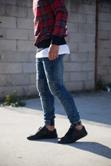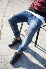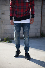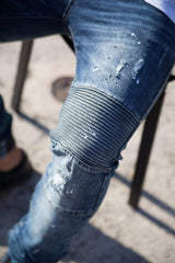 Blaue Herrenjeans von Sixth June. Biker-Stil. Zerstöre an den Knien. Weißer Farbfleckeffekt. Elastischer Boden. Schlanke Passform.