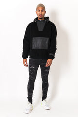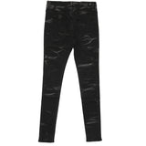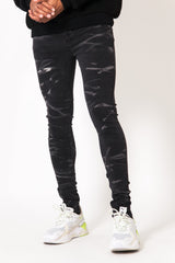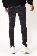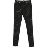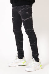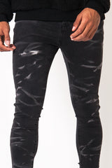 Herrenjeans der Marke Sixth June. Weißer, wellenförmiger Wascheffekt auf der Vorder- und Rückseite. Knopfverschluss, Vorder- und Gesäßtaschen. Eng passend. Schwarzes Modell, sehr dunkelgraues Aussehen.