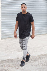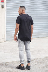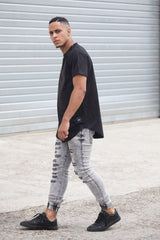Ausgebleichte graue Herrenjeans von Sixth June. Verblasster Effekt. Destroyed-Effekt vorne. Fester Saum mit Gummizug. Schlanke Passform.