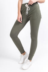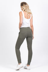 Damen-Jogginghose von Sixth June mit elastischem Band und langen Kordelzügen in der Taille. Vorder- und Gesäßtaschen, schmale Passform und leicht hohe Taille. Khaki-Modell.