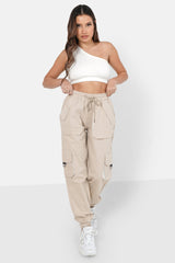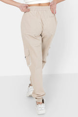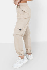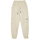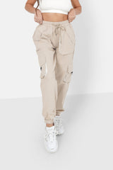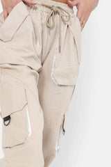 Taschen auf Kniehöhe mit Schnallen, Gesäßtaschen, Perlendetails an den Taschen, Gummizug an der Taille und an den Knöcheln mit Klettverschluss.