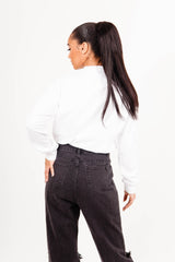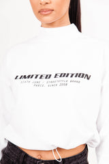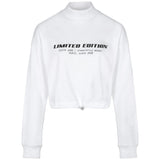 Damen-Sweatshirt der Marke Sixth June. „Limited Edition“-Schriftzug in Schwarz in der Mitte. Kordelzug am Saum, Gummizug an den Bündchen. Klassischer Schnitt, kurzer Crop-Top-Stil. Weißes Modell.