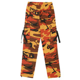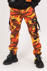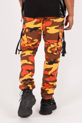 Camouflage-Print und große Seitentaschen mit Riemen. Kordelzug in der Taille und verstellbarer Gummizug an den Knöcheln.