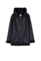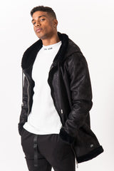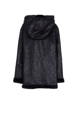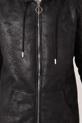 Sixth June Herrenmantel aus Kunstleder. Innen mit Fleecefutter. Weiter Schnitt, überschnittene Schultern, Kapuze, Seitentaschen, Kordelzug unten und Reißverschluss. Schwarzes Modell.