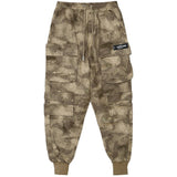 Cargohosen der Marke Sixth June für Herren. Safari-Print im Militärstil mit taktischen Taschen vorne (Klettverschluss) und Cargo-Einsätzen. Elastischer Bund mit Kordelzug, Taschen vorne, Cargotaschen hinten, Rippbündchen an den Knöcheln. Weiter Schnitt. Beigefarbenes Modell.