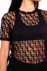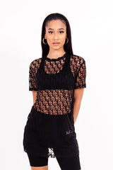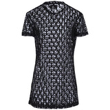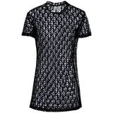 Langes Kurzarm-T-Shirt für Damen der Marke Sixth June. SJ gewebt, Samteffekt. Durchgehend transparent. Klassischer, langer Schnitt. Schwarzes Modell.