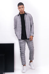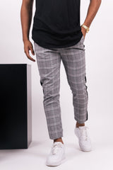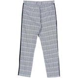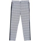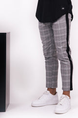 Herrenhose von Sixth June aus Prince-of-Wales-Stoff mit Seitenstreifen. Klassischer 7/8-Schnitt, Seiten- und Gesäßtaschen. Graues Modell mit schwarzen Bändern.