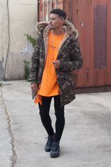 Herrenparka der Marke Sixth June. Innenausstattung aus flauschig weichem und warmem Material. Kapuze mit abnehmbarem Kunstfell (mittlere Größe). Vordertaschen mit Reißverschluss und Knopfverschluss, Innentasche, innenliegender Kordelzug in der Taille, gerippte Bündchen. Klassischer Schnitt. Beigefarbenes Tarnmodell.