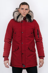 Herrenparka von Sixth June mit weichem und warmem Futter und einer Kapuze mit zweifarbigem Kunstfell (abnehmbar). Schmale Passform mit innenliegendem Kordelzug in der Taille, doppeltem Verschluss (Reißverschluss und Knöpfe) und gerippten Kanten an den Ärmeln. Zwei Seitentaschen, zwei Brusttaschen, eine Reißverschlusstasche am linken Arm und eine Innentasche aus weichem Stoff. Hochdichtes, gepolstertes und wasserabweisendes Gewebe. Rotes Modell mit beigem Futter und zweifarbigem Fell in Beige und Schwarz.